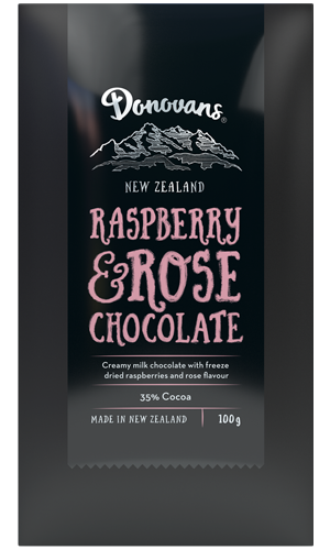 Creamy milk chocolate with freeze dried raspberries and rose flavour.