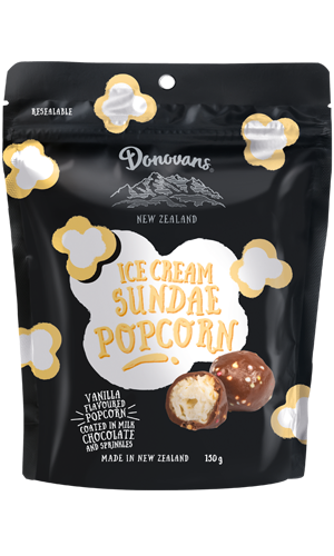 Vanilla ice cream flavoured popcorn coated in creamy milk chocolate and sprinkles.
