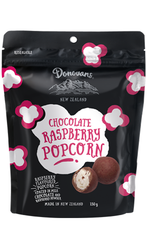 Raspberry flavoured popcorn coated in creamy milk chocolate and dusted with freeze dried raspberry powder.
