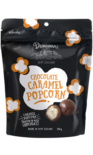 Caramel popcorn coated in creamy milk chocolate.