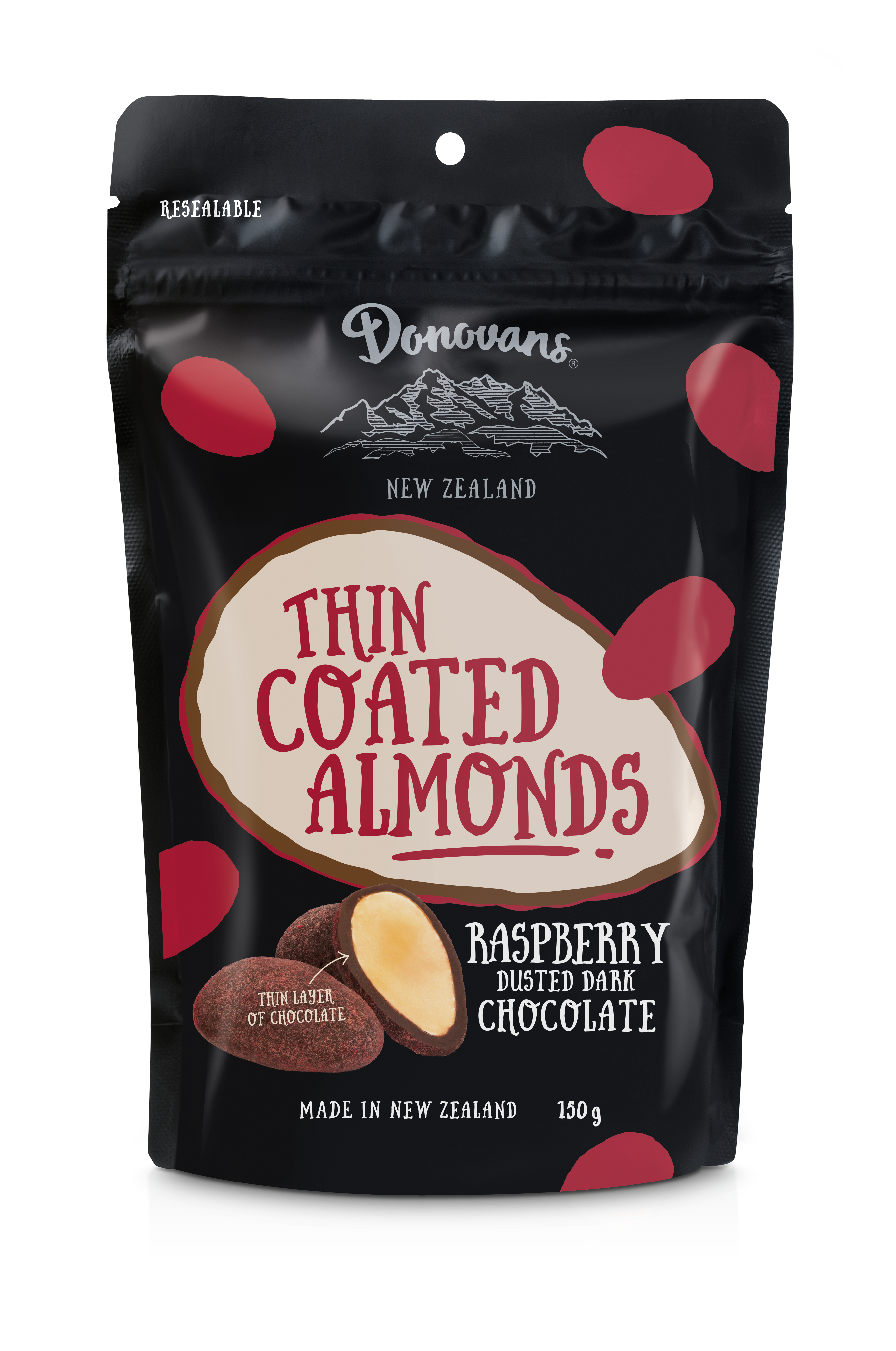 Crunchy roasted almonds dipped in dark chocolate and dusted in raspberry.