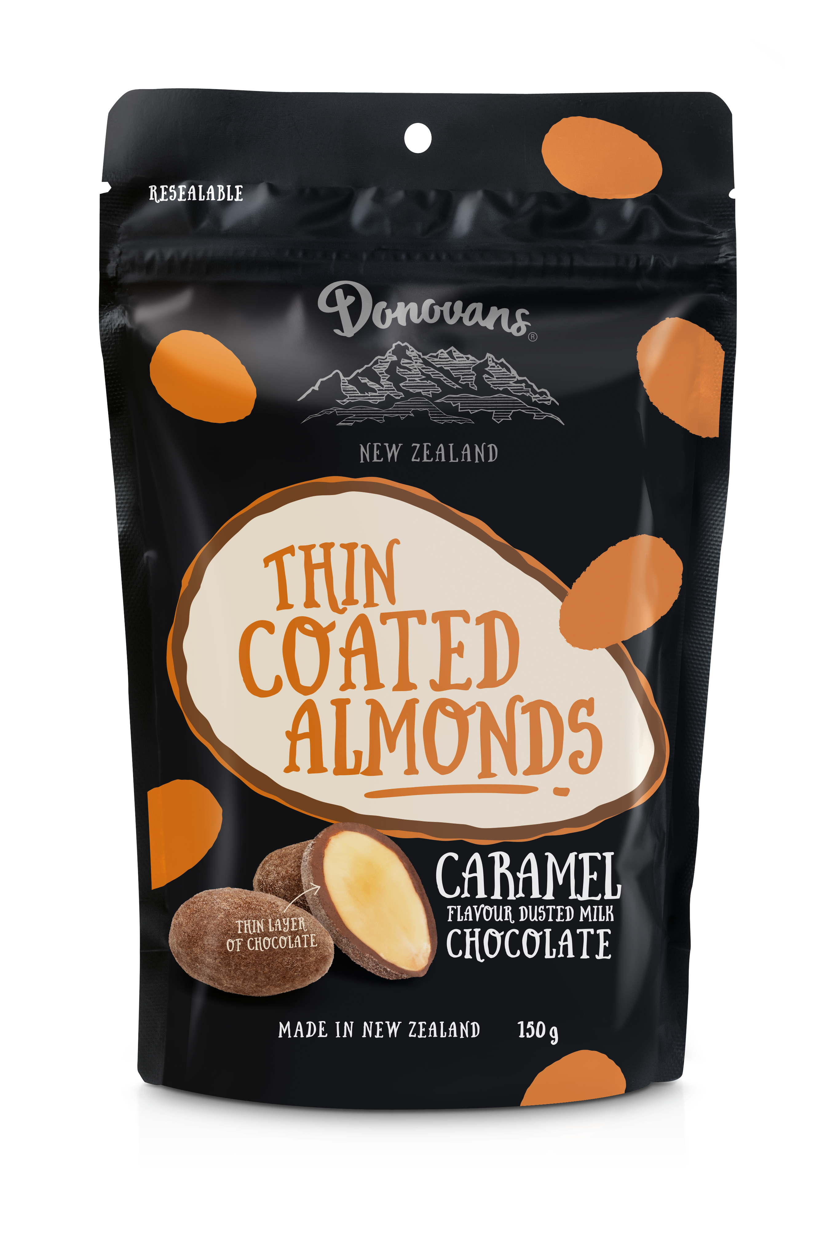 Crunchy roasted almonds dipped in milk chocolate and dusted in caramel.